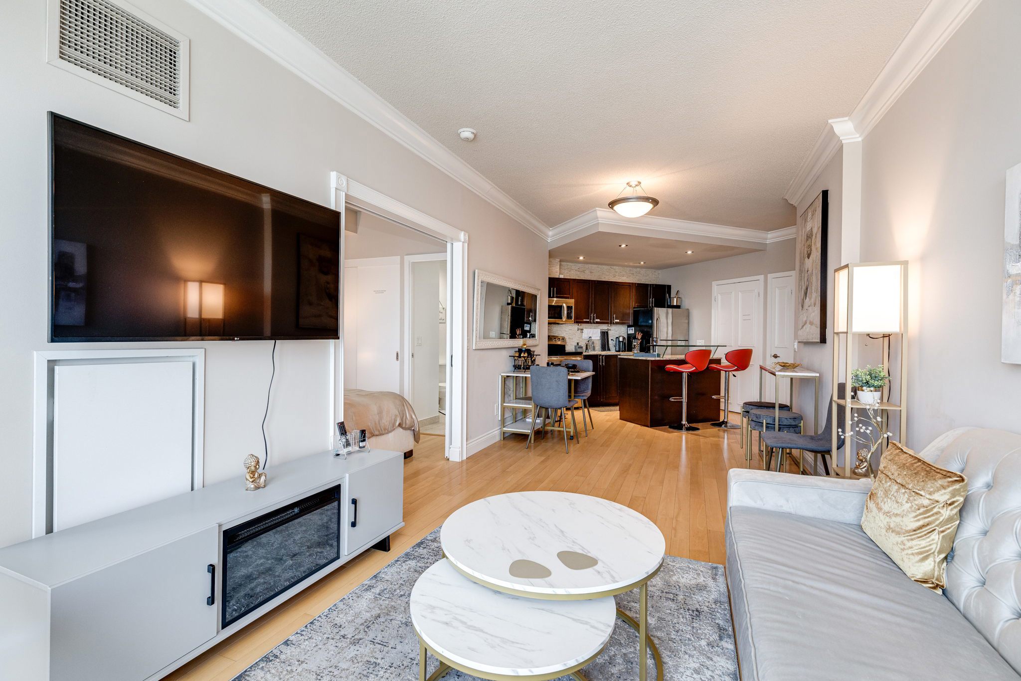 Welcome to this waterfront one-bedroom suite in a luxurious downtown location with free parking! This well-appointed unit boasts a spacious 700 sq ft design, including a cozy bedroom, a modern kitchen, and a lovely living room. With amenities including an elevator, 24/7 security, and plenty of nearby dining/shopping options, this property provides all the comforts of home. Perfect for a couple or small family, this modern abode is a perfect fit for your next stay!